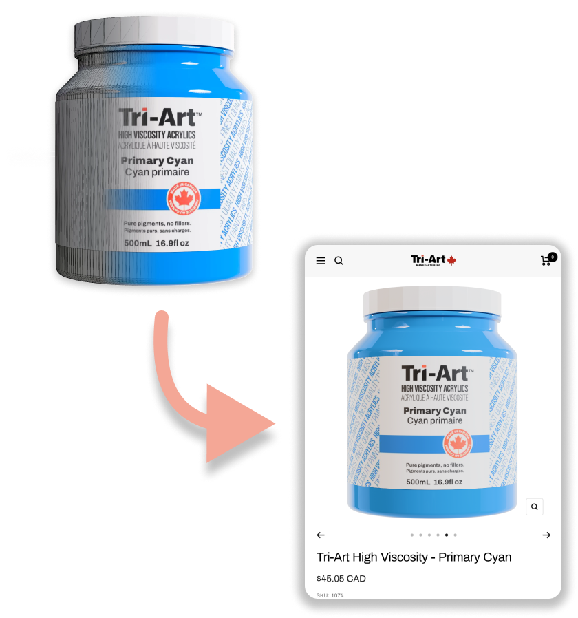 With the completion of the label redesign project, we now needed new product images for online sales and advertising. Previously, the company would take a few months of time to manually photograph products, edit and upload the images to the online store. With thousands of colours and mediums across various product lines, I realized 3D rendering was the solution we needed to dramatically speed up this process.